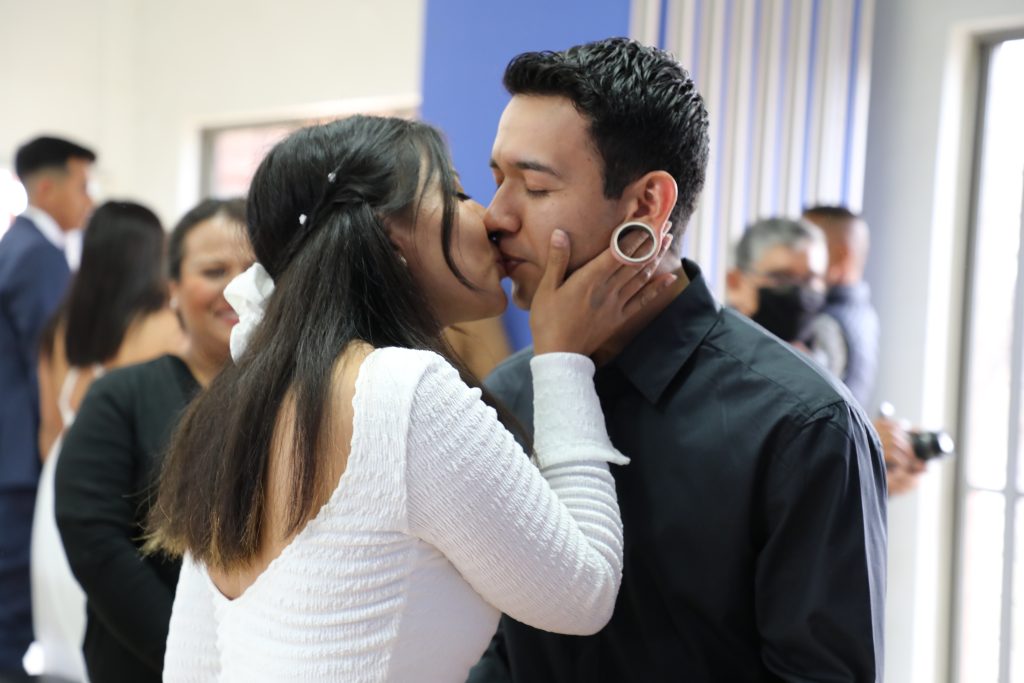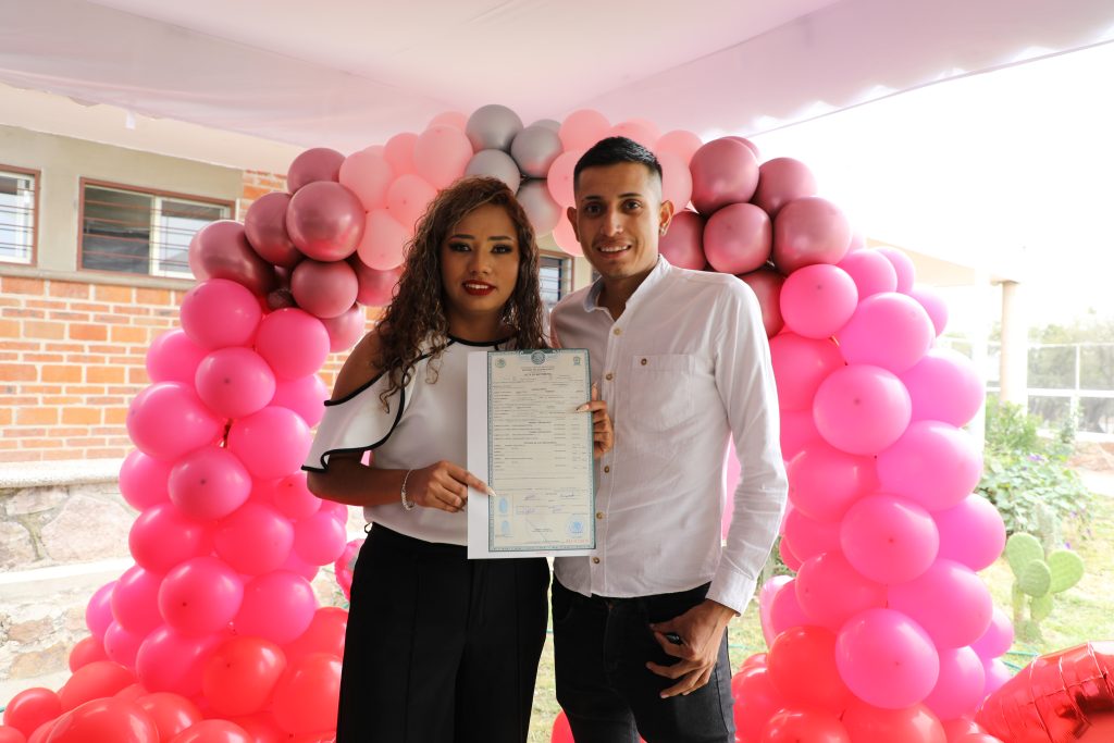 En el municipio de León en el Centro Guanajuato Contigo Sí de Villas de San Nicolás se celebraron 77 matrimonios por el civil, entre ellos está el de Luis Gerardo Hernández Arenas y Laura Jacqueline Ramírez Castro, que tienen 9 años como pareja, y son padres de 2 hijos.