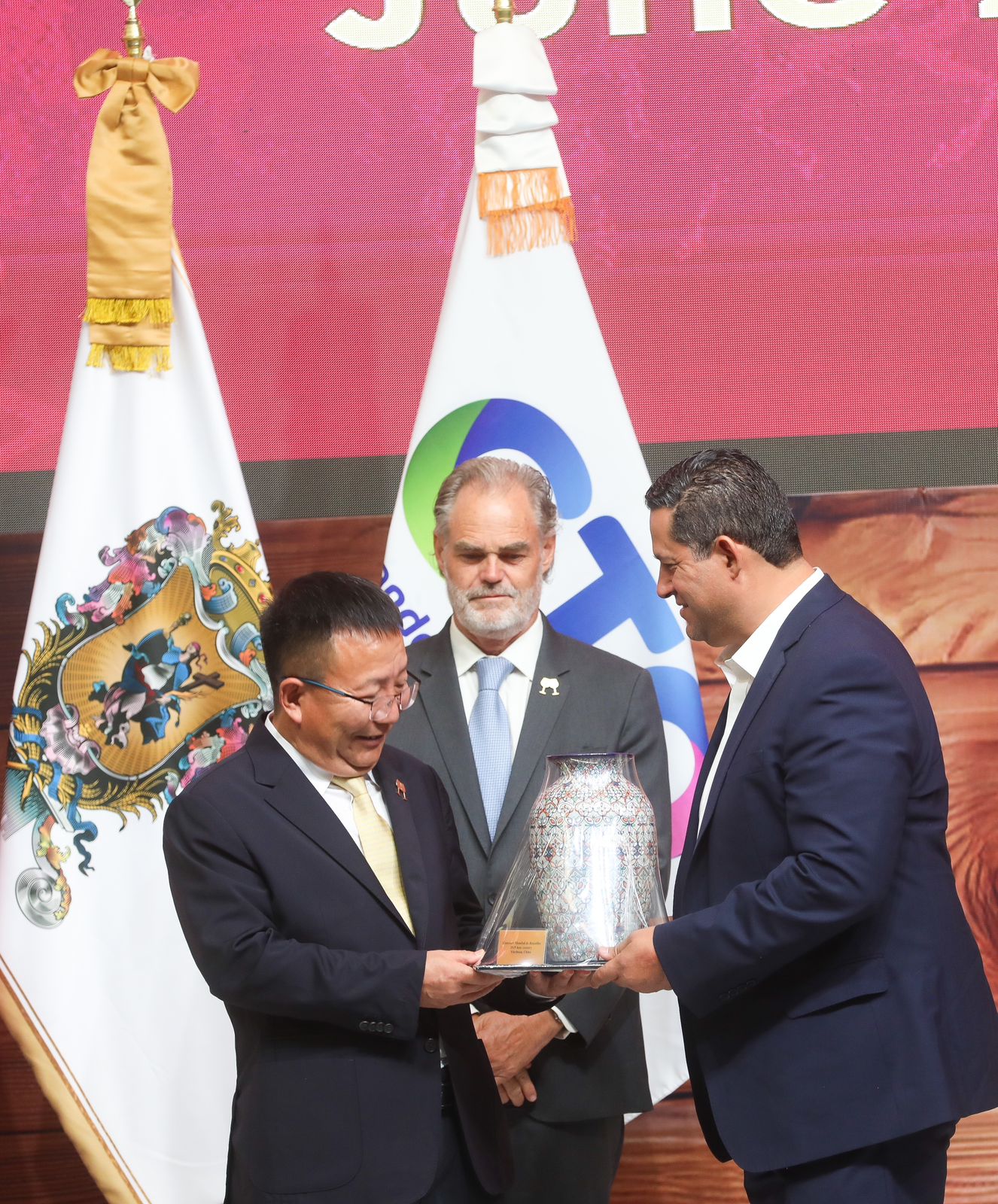El Gobernador del Estado de Guanajuato, Diego Sinhue Rodríguez Vallejo, entregó la estafeta para la siguiente edición del Concurso Mundial de Bruselas a Li Quancai, alcalde de la ciudad de Yinchuan, en Ningxia, China.