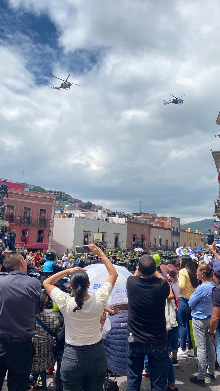 Llamaron la atención los equipos de la Policía Estatal, quienes desde el aire, con cuatro helicópteros, sorprendieron a las personas que acudieron a observar el desfile.