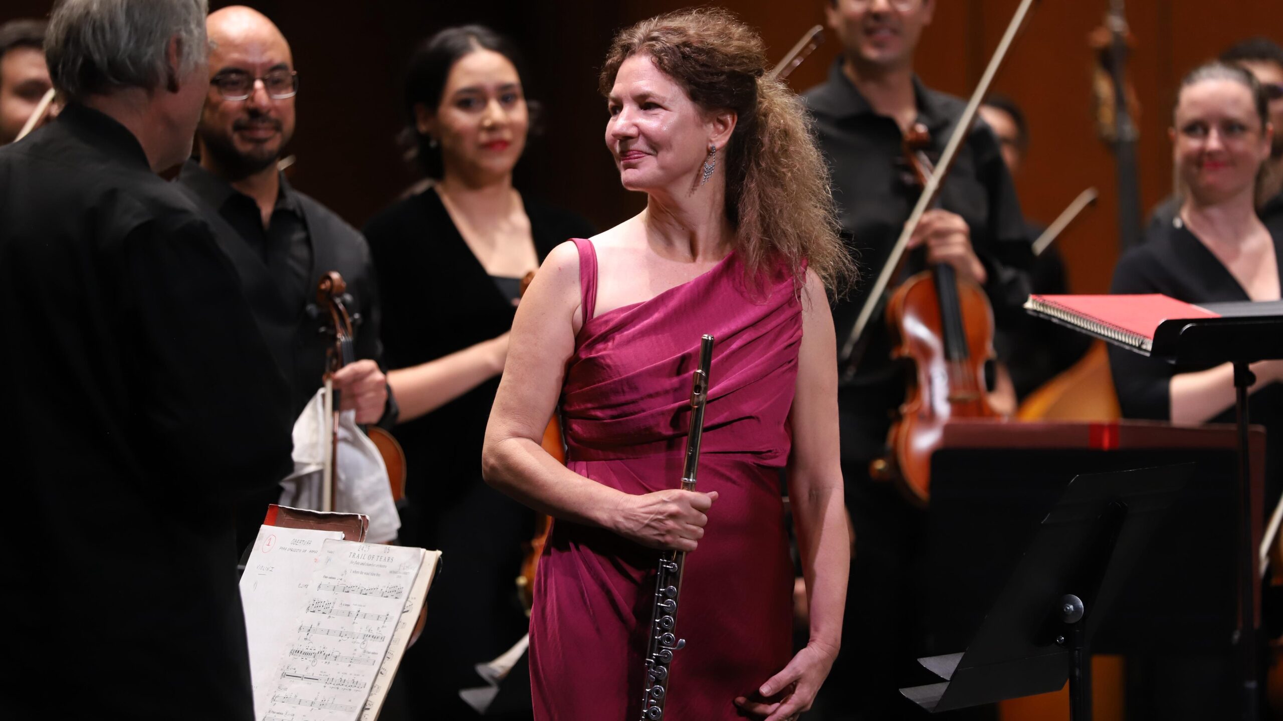 La solista Megan Maiorana ofreció una interpretación excepcional. Flautista principal de la Orquesta Sinfónica de Aguascalientes y profesora en la Universidad Autónoma de Zacatecas, ha destacado también a nivel internacional, con presentaciones en el Carnegie Hall y múltiples giras.