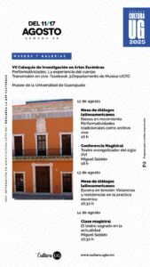 Como parte del VII Coloquio de Investigación en Artes Escénicas, el Museo de la UG será sede de cuatro actividades clave entre el 12 y 14 de agosto. Habrá mesas de diálogo sobre performatividades tradicionales, teatro evangelizador del siglo XVI, violencias y resistencias en la práctica escénica, así como una clase magistral sobre teatro sagrado actual, a cargo de Miguel Sabido.