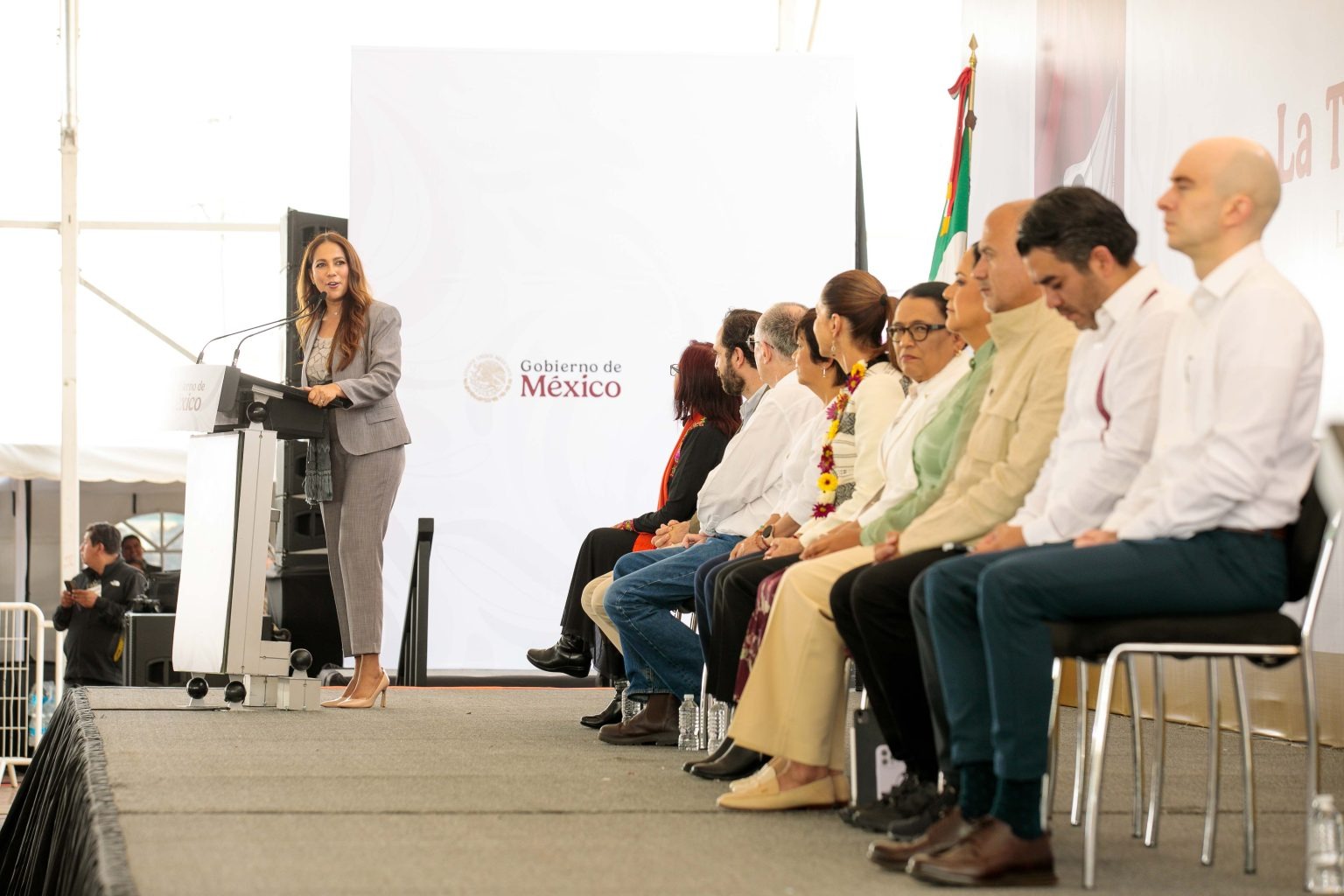 En el evento acompañaron a la Presidenta integrantes de su Gabinete: Rosa Icela Rodríguez, Secretaria de Gobernación; Ariadna Montiel, Secretaria del Bienestar; Jesús Artemio Esteva, Secretario de Infraestructura; Edna Elena Vega, Secretaria de Desarrollo Agrario; y Julio Berdegué, Secretario de Agricultura.