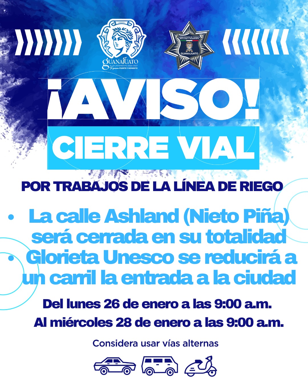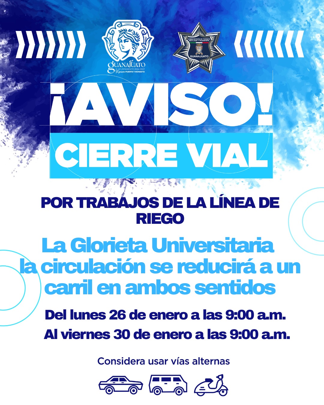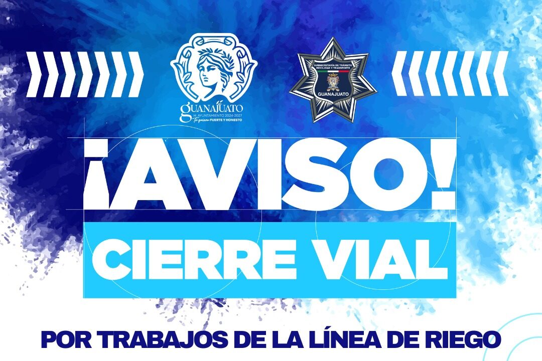 Con el objetivo de dar continuidad a los trabajos de mantenimiento en la línea de riego, la Subsecretaría de Tránsito, Movilidad y Transporte implementará cierres viales en Guanajuato y ajustes a la circulación en diferentes zonas de la ciudad.