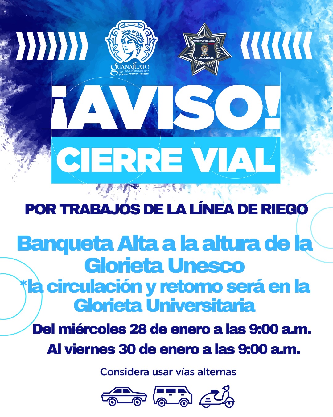Ante estos cierres viales en Guanajuato, se recomienda a las y los automovilistas utilizar como rutas alternas las calles Ave María o Pozuelos, así como atender en todo momento las indicaciones del personal de Tránsito, Movilidad y Transporte.