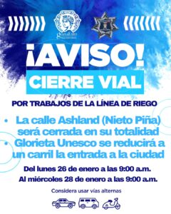 El lunes 26 de enero, a partir de las 9:00 de la mañana, se llevará a cabo el cierre total de la calle Ashland, también conocida como Nieto Piña. Este cierre permanecerá vigente hasta el miércoles 28 de enero a las 9:00 de la mañana.
