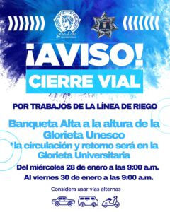 Asimismo, desde las 9:00 de la mañana del miércoles 28 de enero y hasta las 9:00 de la mañana del viernes 30 de enero, se mantendrá cerrada la circulación en Banqueta Alta, a la altura de la Glorieta UNESCO.